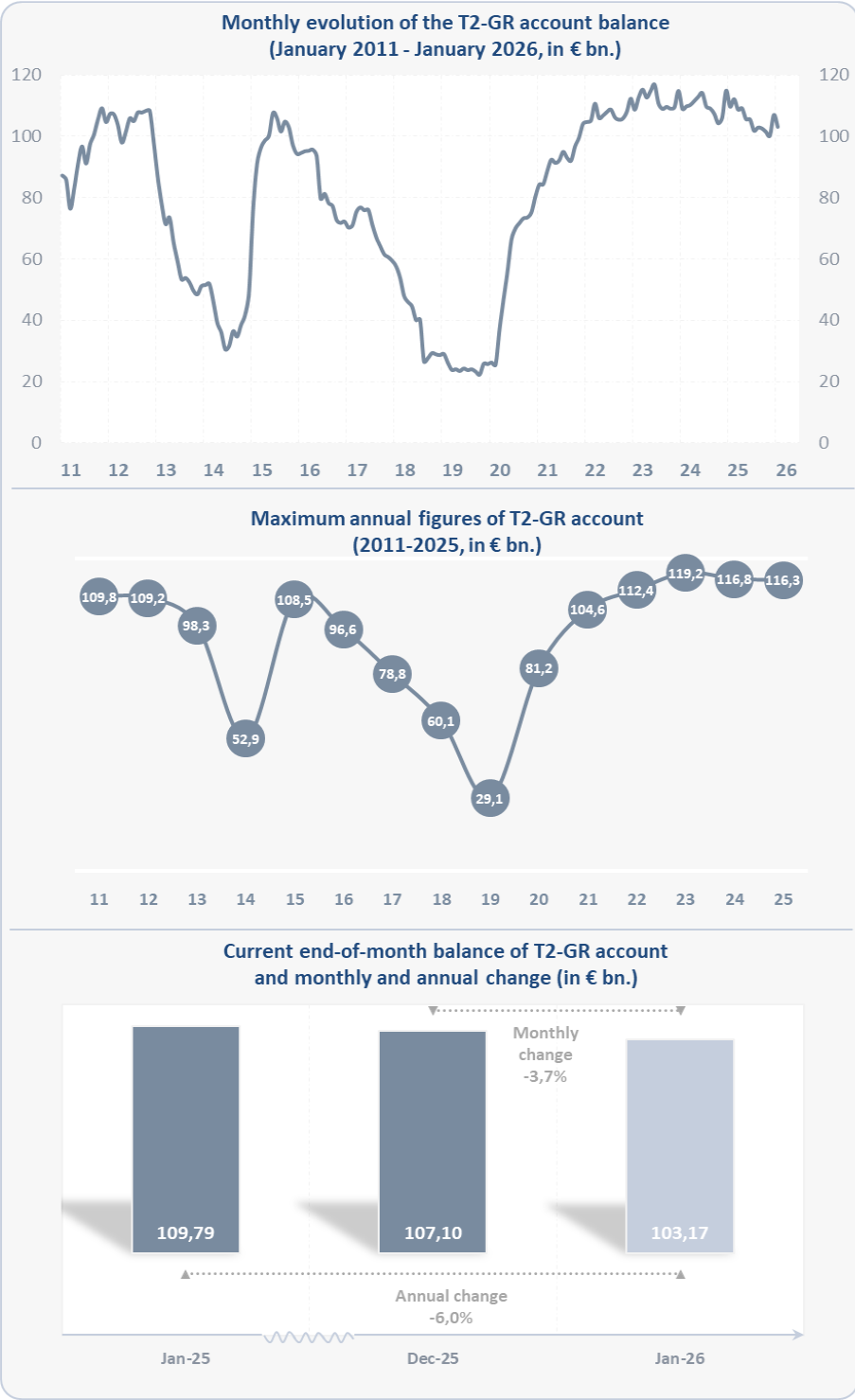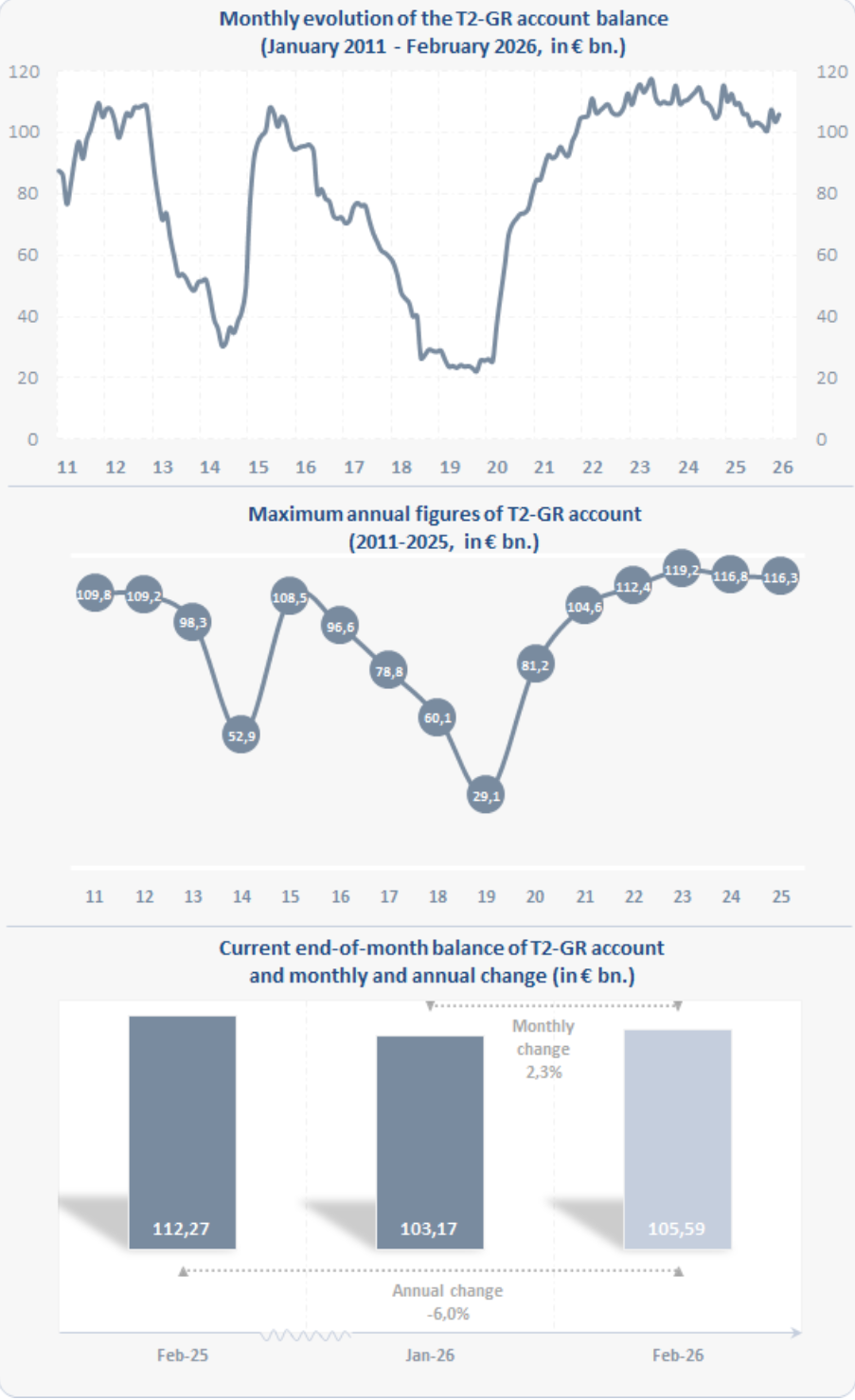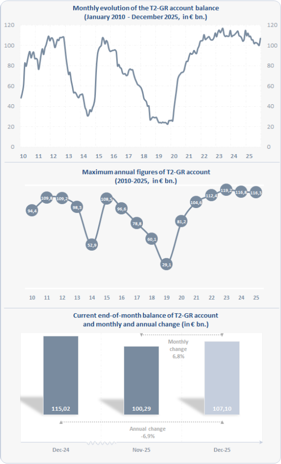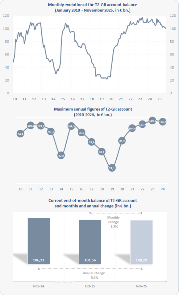 The following charts show the evolution over time of the balance (in € billions) of the BoG ECB account in TARGET, its maximum annual values, as well as its recent change both on an annual and a monthly basis.