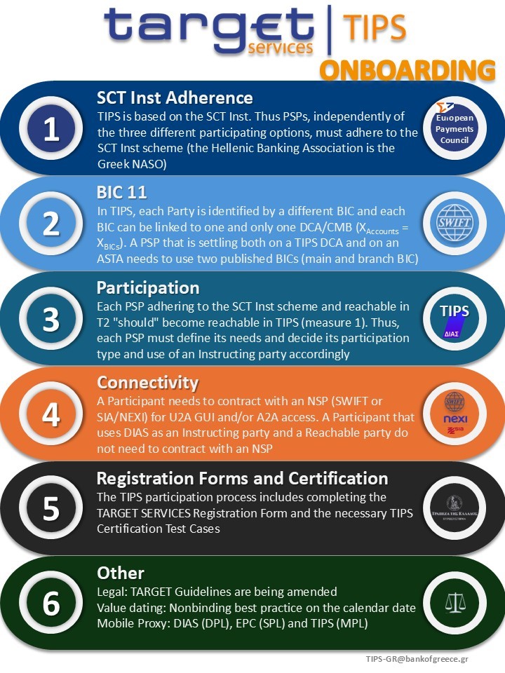 To initiate the onboarding procedure and submit the relevant documentation, please contact TIPS GR – Service desk.