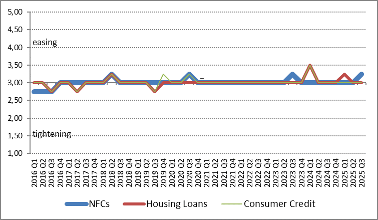 - The credit standards for household loans remained unchanged regarding housing loans and consumer credit loans for the third quarter of 2025. The terms and conditions tightened somewhat for housing loans, while for consumer loans they remained unchanged in the third quarter of 2025. The demand for housing loans decreased, while the demand for consumer credit increased.