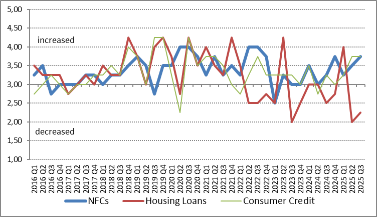 During the third quarter of 2025, the overall demand for loans to NFCs increased due to corporate financing needs and amplification of alternative sources of funding (see Chart 2). In the fourth quarter of 2025, banks expect the demand from NFCs to increase.