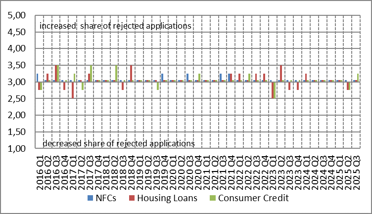 During the third quarter of 2025, the ratio of rejected applications for housing loans and consumer credit remained almost unchanged (see Chart 3).
