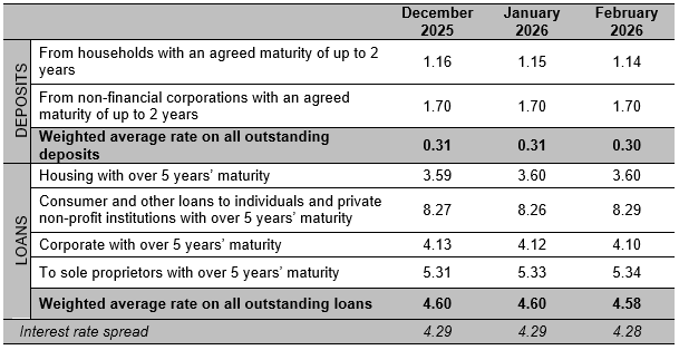 In February 2026, the weighted average interest rate on outstanding amounts of deposits (including overnight deposits) remained almost unchanged at 0.30%.