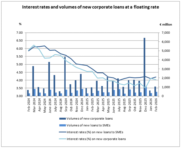 The average interest rate on new corporate loans with a defined maturity at a floating rate decreased by 8 basis points to 4.03%. The average interest rate on loans with a defined maturity at a floating rate to small and medium-sized enterprises (SMEs) increased by 9 basis points to 4.19%.