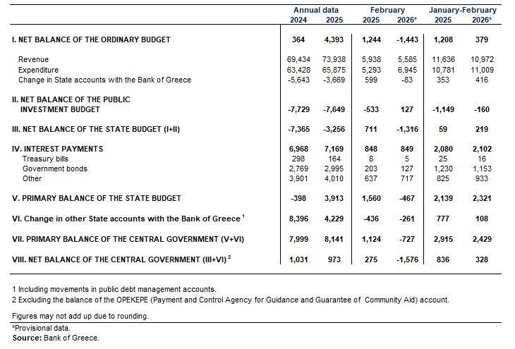In January-February 2026, the central government cash balance recorded a surplus of €328 million, compared to a surplus of €836 million in the same period of 2025. During this period, ordinary budget revenue amounted to €10,972 million, compared to €11,636 million in the corresponding period of last year. Ordinary budget expenditure amounted to €11,009 million, from €10,781 million in January-February 2025.