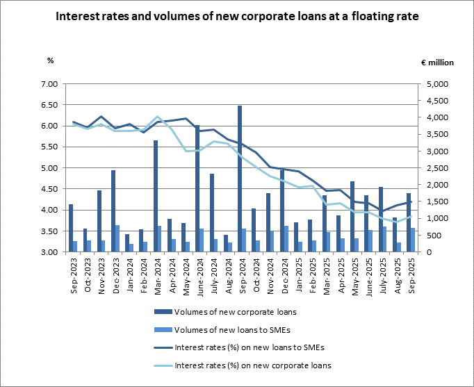 The average interest rate on new corporate loans with a defined maturity at a floating rate increased by 13 basis points to 3.84%. The average interest rate on loans with a defined maturity at a floating rate to small and medium-sized enterprises (SMEs) increased by 8 basis points to 4.19%.