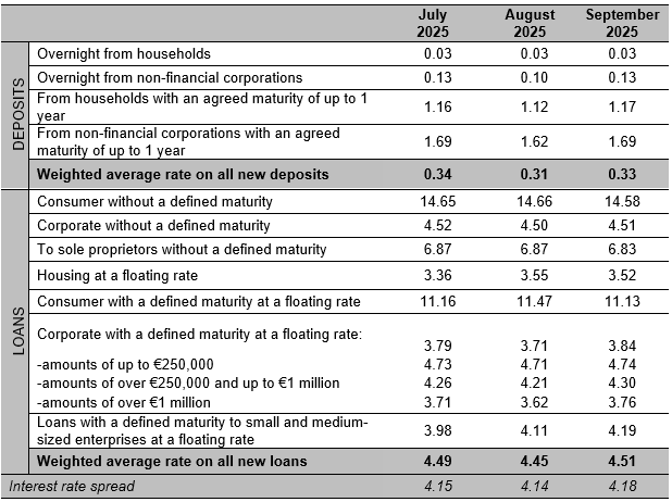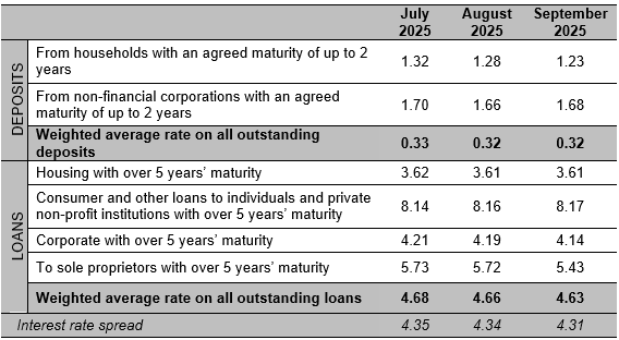 - In September 2025, the weighted average interest rate on new deposits remained almost unchanged at 0.33%, while the corresponding rate on new loans increased to 4.51%.