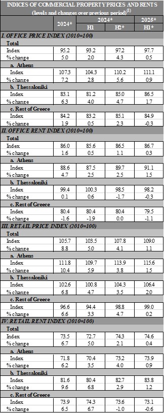 According to provisional data, in the first half of 2025 nominal prime retail prices for the entire country increased by 1.1% compared with the second half of 2024. Over the same period, nominal prime retail prices increased by 1.5% in the wider Athens area, by 2.0% in Thessaloniki and by 0.2% in the rest of Greece, compared with the previous half-year.