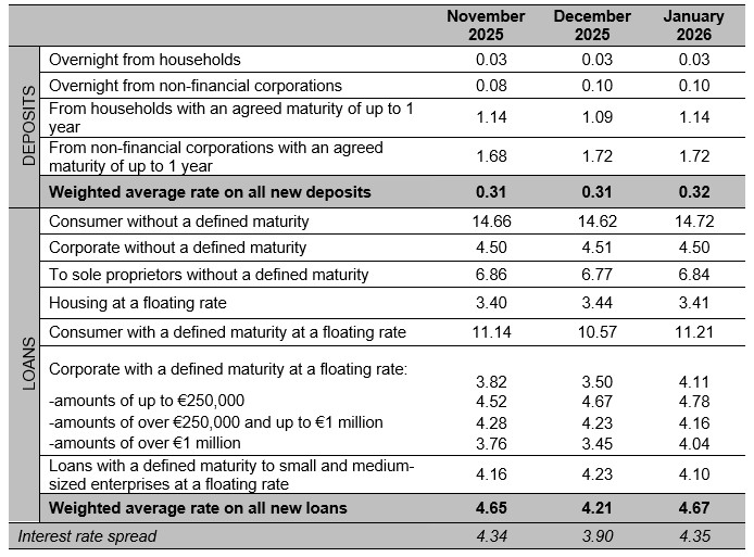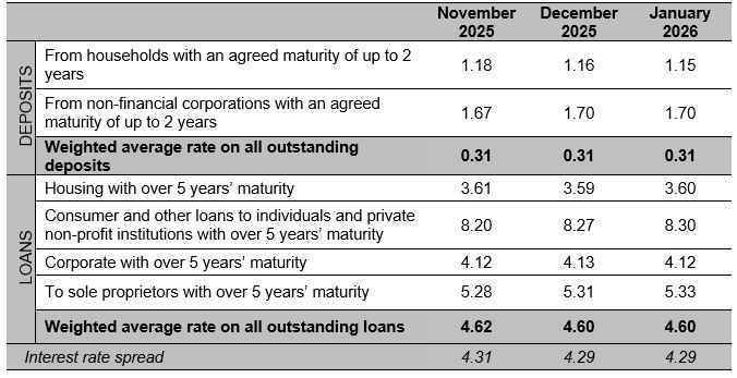 - In January 2026, the weighted average interest rate on new deposits remained almost unchanged at 0.32%, while the corresponding rate on new loans increased to 4.67%.