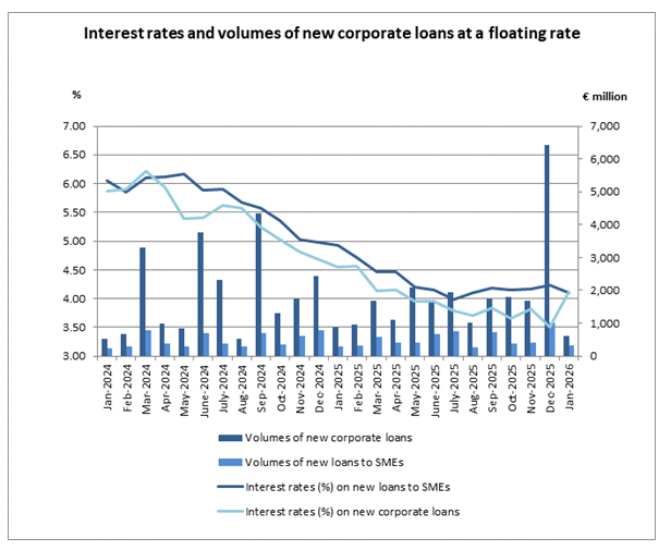 The average interest rate on new corporate loans with a defined maturity at a floating rate increased by 61 basis points to 4.11%. The average interest rate on loans with a defined maturity at a floating rate to small and medium-sized enterprises (SMEs) decreased by 13 basis points to 4.10%.