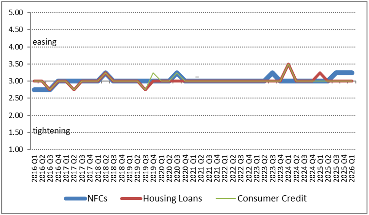 In the first quarter of 2026, the credit standards for loans to non-financial corporations (NFCs) remained almost unchanged compared with the fourth quarter of 2025 (see Chart 1), in line with the expectations expressed in the previous quarterly survey round. Banks expect credit standards to remain unchanged during the second quarter of 2026.