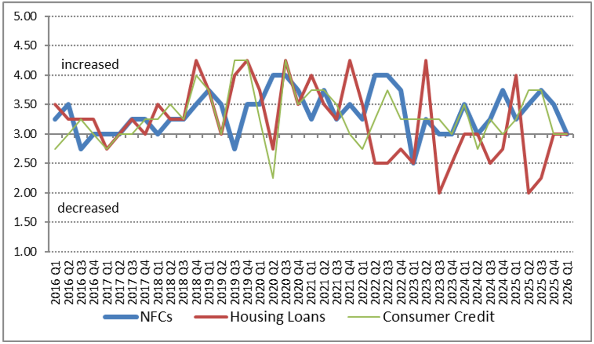 - The credit standards and overall terms and conditions for loans to non-financial corporations (NFCs) remained almost unchanged in the first quarter of 2026. The overall demand for corporate loans remained unchanged.