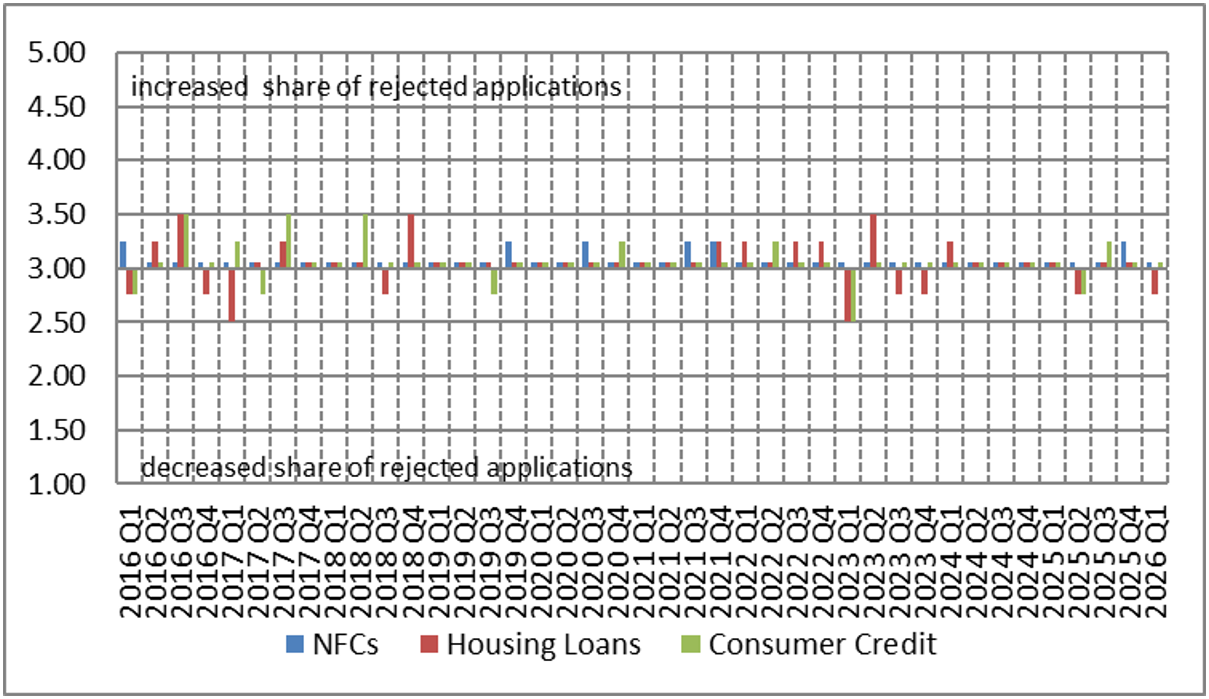 During the first quarter of 2026, the ratio of rejected applications for housing loans remained almost unchanged, while it remained unchanged for consumer credit (see Chart 3).