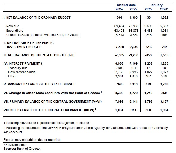In January 2026, the central government cash balance recorded a surplus of €1,904 million, compared to a surplus of €560 million in the same month of 2025. During this month, ordinary budget revenue amounted to €5,387 million, compared to €5,698 million in the corresponding month of last year. Ordinary budget expenditure amounted to €4,064 million, from €5,488 million in January 2025.