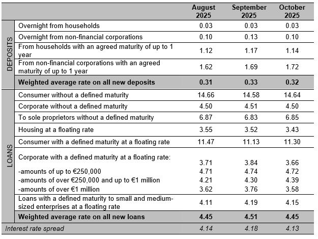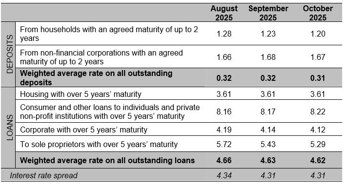 - In October 2025, the weighted average interest rate on new deposits remained almost unchanged at 0.32%, while the corresponding rate on new loans decreased to 4.45%.