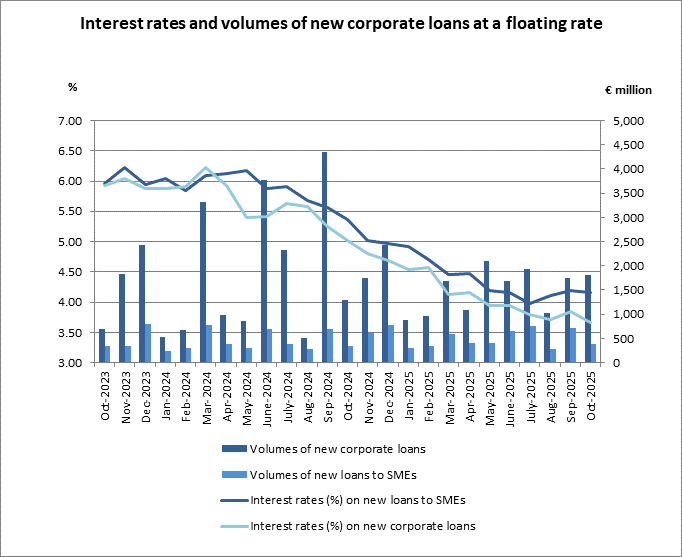 The average interest rate on new corporate loans with a defined maturity at a floating rate decreased by 18 basis points to 3.66%. The average interest rate on loans with a defined maturity at a floating rate to small and medium-sized enterprises (SMEs) decreased by 4 basis points to 4.15%.