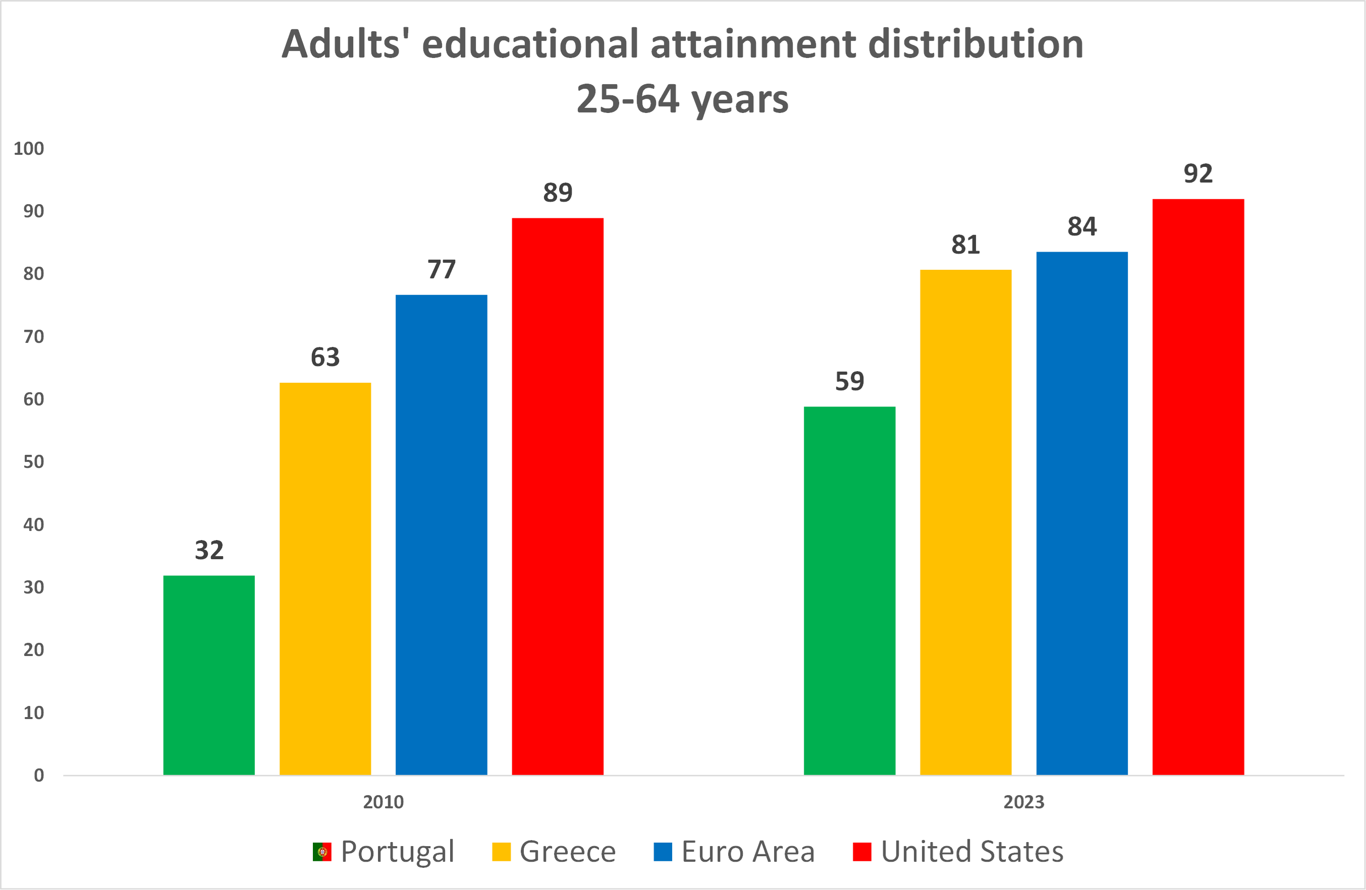 This progress aligns with the insights of Nobel Laureate Philippe Aghion, who has long argued that innovation thrives at the frontier of knowledge—and that frontier is populated by the most educated societies. In a 2010 keynote at the Banco de Portugal, Aghion reviewed Portugal’s educational statistics—where only 30% of the population held at least an upper secondary degree—and concluded that the best path forward was imitation. This lag was partly a legacy of underinvestment during the dictatorship era, but even among younger generations, Portugal still trailed all developed economies. Today, Portuguese youths enter the labor market with schooling close to that of more developed economies: 45% are college graduates.