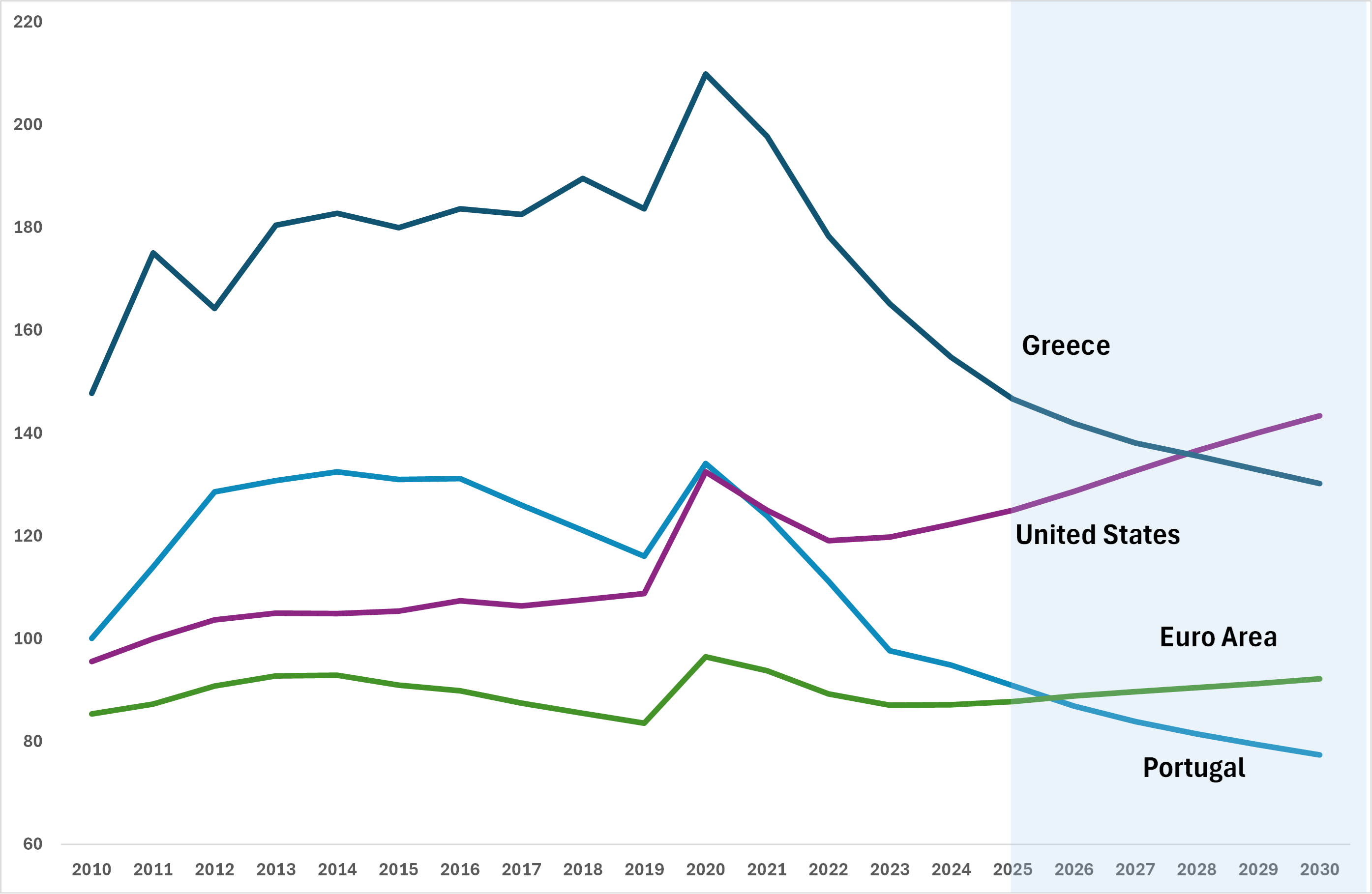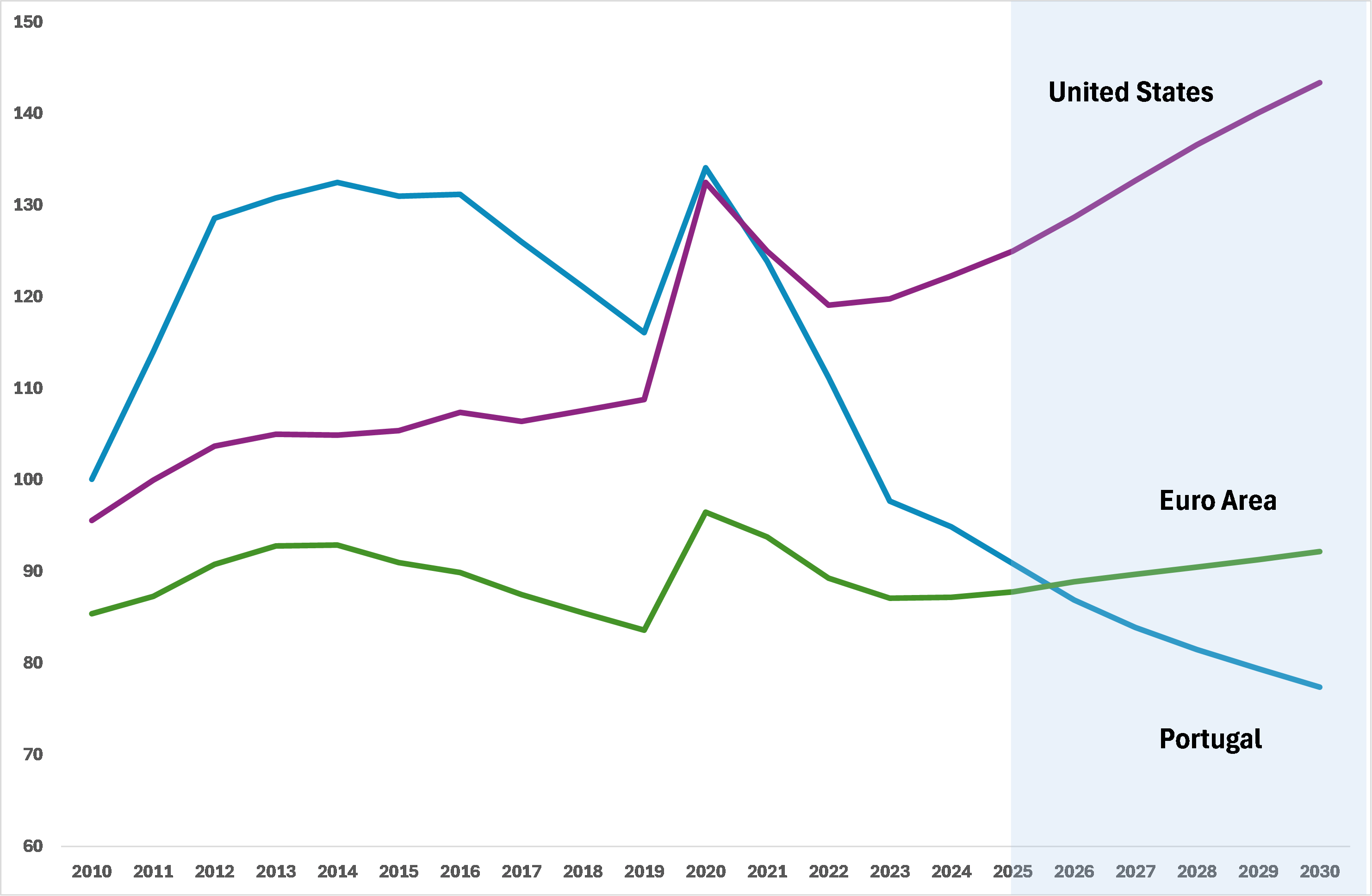 In the Euro Area, the figures are modest: 85.4% in 2010, 87.8% in 2025, and a projected 92.2% by 2030. On the contrary, the United States debt stood at 95.6% of GDP in 2010, surged to 125% in 2025, and is projected to reach 143% by 2030.
