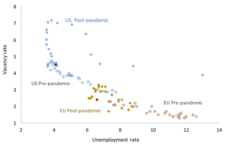 Figure 6: Beveridge curve – United States and Euro Area (in percentage). Sources: BLS and EUROSTAT.