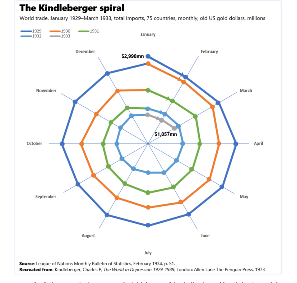 Trade fragmentation following a tariffs war, with generalized retaliation can be destructive to international trade. The Kindleberger Spiral, named after the economic historian Charles Kindleberger, represents the catastrophic decline in global trade between 1929 and 1933. Its spiral shape illustrates the month-by-month contraction in trade, showing how retaliatory tariffs, such as the U.S. Smoot-Hawley Tariff Act of 1930, contributed to the economic downturn of the Great Depression.