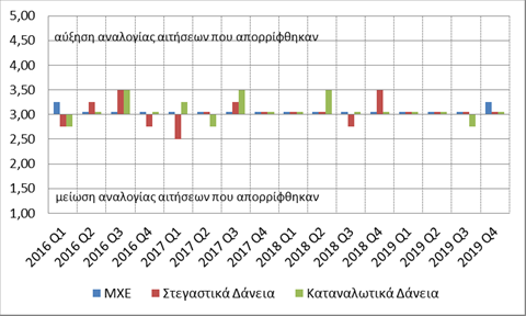 Η αναλογία των αιτήσεων για δάνεια προς νοικοκυριά που απορρίφθηκαν παρέμεινε κατά βάση αμετάβλητη σε σχέση με το προηγούμενο τρίμηνο (βλ. Διάγραμμα 3).
