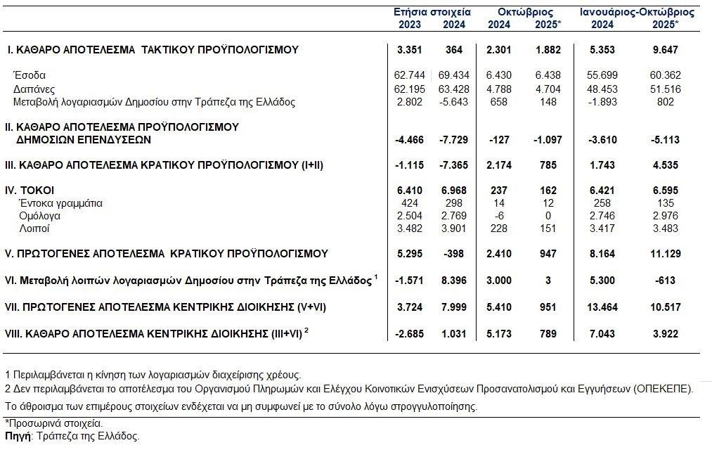 Την περίοδο Ιανουαρίου-Οκτωβρίου 2025, το ταμειακό αποτέλεσμα της κεντρικής διοίκησης παρουσίασε πλεόνασμα 3.922 εκατ. ευρώ, έναντι πλεονάσματος 7.043 εκατ. ευρώ την αντίστοιχη περίοδο του 2024. Κατά την περίοδο αυτή, τα έσοδα του τακτικού προϋπολογισμού διαμορφώθηκαν σε 60.362 εκατ. ευρώ, από 55.699 εκατ. ευρώ πέρυσι. Όσον αφορά τις δαπάνες του τακτικού προϋπολογισμού, αυτές διαμορφώθηκαν σε 51.516 εκατ. ευρώ, από 48.453 εκατ. ευρώ την περίοδο Ιανουαρίου-Οκτωβρίου 2024.