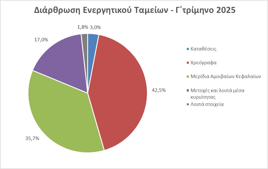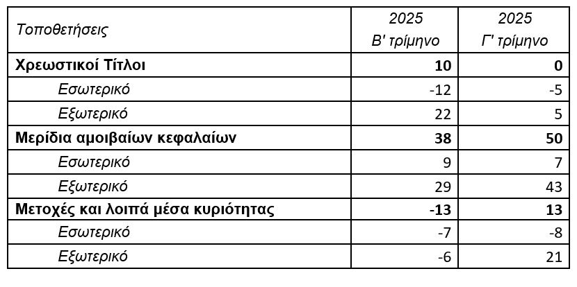 Η αξία των συνολικών τοποθετήσεων σε μετοχές και λοιπά μέσα κυριότητας αυξήθηκε στα 467 εκατ. ευρώ στο τέλος του γ΄ τριμήνου του 2025, έναντι 423 εκατ. ευρώ το προηγούμενο τρίμηνο, εξέλιξη που οφείλεται τόσο σε καθαρές αγορές μετοχών του εξωτερικού όσο και σε άνοδο των αποτιμήσεών τους. Το ποσοστό των τοποθετήσεων σε μετοχές επί του συνόλου του ενεργητικού αυξήθηκε στο 17,0%, το γ΄ τρίμηνο του 2025, έναντι 16,0% το προηγούμενο τρίμηνο.
