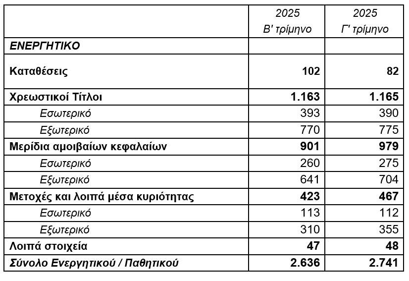 Η αξία των συνολικών τοποθετήσεων σε μερίδια αμοιβαίων κεφαλαίων αυξήθηκε στα 979 εκατ. ευρώ στο τέλος του γ΄ τριμήνου του 2025, έναντι 901 εκατ. ευρώ το προηγούμενο τρίμηνο. Η αύξηση της αξίας των τοποθετήσεων οφείλεται κυρίως σε καθαρές αγορές , αλλά και σε άνοδο των αποτιμήσεων μεριδίων του εξωτερικού. Το ποσοστό των τοποθετήσεων σε μερίδια αμοιβαίων κεφαλαίων επί του συνόλου του ενεργητικού αυξήθηκε στο 35,7%, έναντι 34,2% το προηγούμενο τρίμηνο.