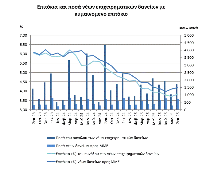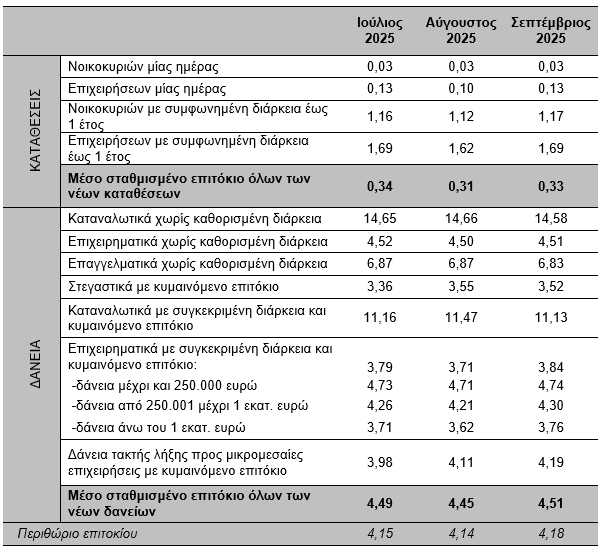 - Τον Σεπτέμβριο του 2025, το μέσο σταθμισμένο επιτόκιο των νέων καταθέσεων παρέμεινε σχεδόν αμετάβλητο στο 0,33%, ενώ το αντίστοιχο επιτόκιο των νέων δανείων αυξήθηκε στο 4,51%.