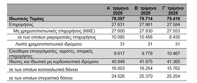 Η ονομαστική αξία των υπό διαχείριση δανείων προς ελεύθερους επαγγελματίες, αγρότες και ατομικές επιχειρήσεις αυξήθηκε κατά 689 εκατ. ευρώ έναντι του προηγούμενου τριμήνου και διαμορφώθηκε σε 10.467 εκατ. ευρώ στο τέλος του γ΄ τριμήνου του 2025.