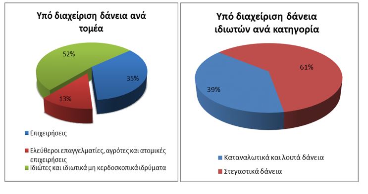 Η ονομαστική αξία των υπό διαχείριση δανείων προς ιδιώτες και ιδιωτικά μη κερδοσκοπικά ιδρύματα μειώθηκε κατά 610 εκατ. ευρώ έναντι του προηγούμενου τριμήνου και διαμορφώθηκε σε 41.365 εκατ. ευρώ στο τέλος του γ΄ τριμήνου του 2025. Αναλυτικότερα, τα υπό διαχείριση καταναλωτικά δάνεια παρουσίασαν μείωση κατά 492 εκατ. ευρώ και διαμορφώθηκαν σε 15.762 εκατ. ευρώ. Τα υπό διαχείριση στεγαστικά δάνεια παρουσίασαν μείωση κατά 116 εκατ. ευρώ και διαμορφώθηκαν σε 25.254 εκατ. ευρώ.