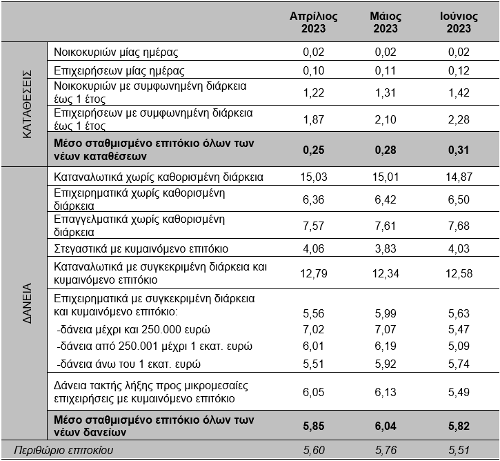 Το μέσο επιτόκιο των νέων επιχειρηματικών δανείων με συγκεκριμένη διάρκεια και κυμαινόμενο επιτόκιο μειώθηκε κατά 36 μονάδες βάσης, τον Ιούνιο του 2023, και διαμορφώθηκε στο 5,63%. Το μέσο επιτόκιο των δανείων τακτής λήξης με κυμαινόμενο επιτόκιο προς μικρομεσαίες επιχειρήσεις (ΜΜΕ) μειώθηκε κατά 64 μονάδες βάσης και διαμορφώθηκε στο 5,49%.