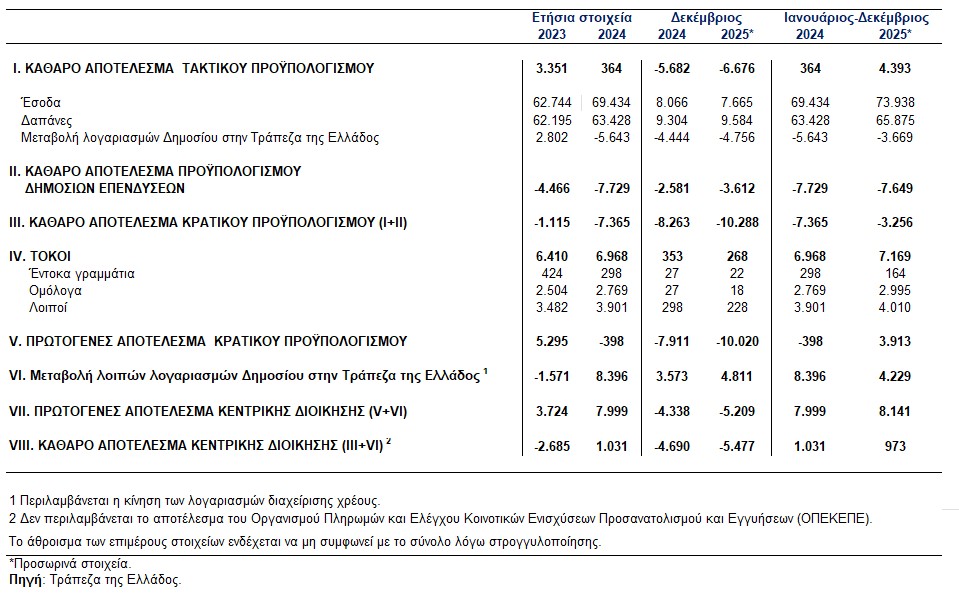 Την περίοδο Ιανουαρίου-Δεκεμβρίου 2025, το ταμειακό αποτέλεσμα της κεντρικής διοίκησης παρουσίασε πλεόνασμα 973 εκατ. ευρώ, έναντι πλεονάσματος 1.031 εκατ. ευρώ την αντίστοιχη περίοδο του 2024. Κατά την περίοδο αυτή, τα έσοδα του τακτικού προϋπολογισμού διαμορφώθηκαν σε 73.938 εκατ. ευρώ, από 69.434 εκατ. ευρώ πέρυσι. Όσον αφορά τις δαπάνες του τακτικού προϋπολογισμού, αυτές διαμορφώθηκαν σε 65.875 εκατ. ευρώ, από 63.428 εκατ. ευρώ την περίοδο Ιανουαρίου-Δεκεμβρίου 2024.