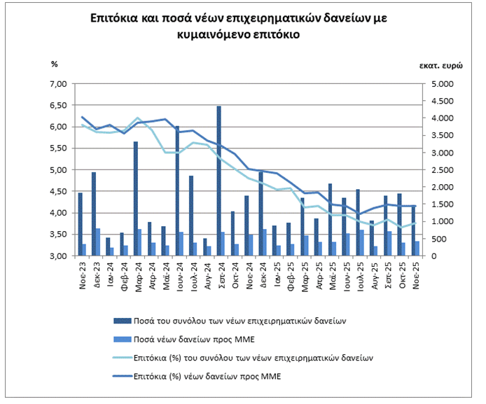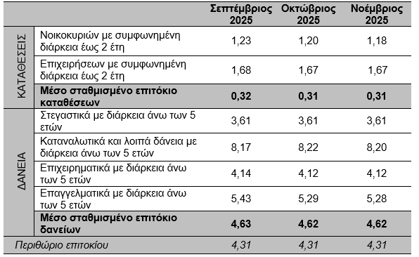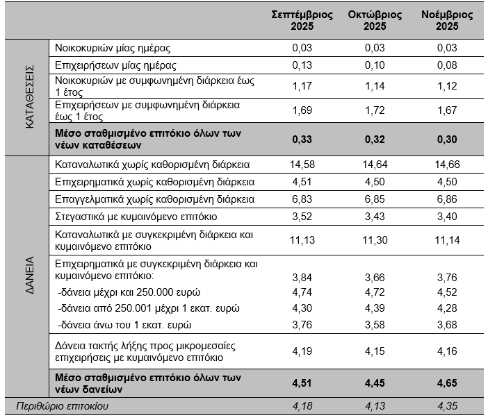 - Το Νοέμβριο του 2025, το μέσο σταθμισμένο επιτόκιο των νέων καταθέσεων παρέμεινε σχεδόν αμετάβλητο στο 0,30%, ενώ το αντίστοιχο επιτόκιο των νέων δανείων αυξήθηκε στο 4,65%.