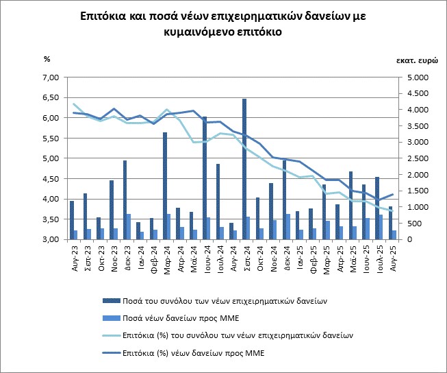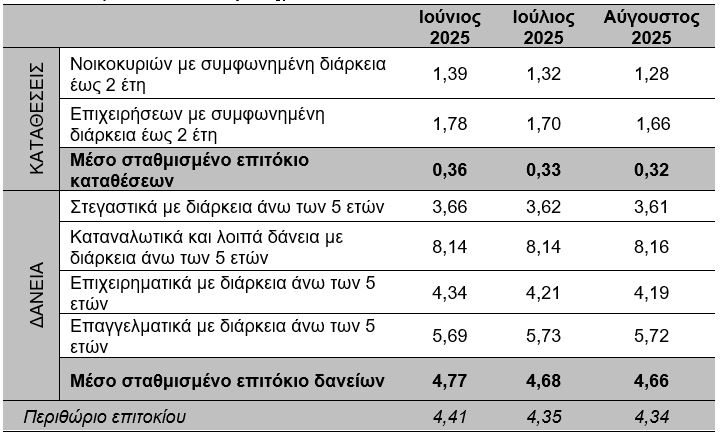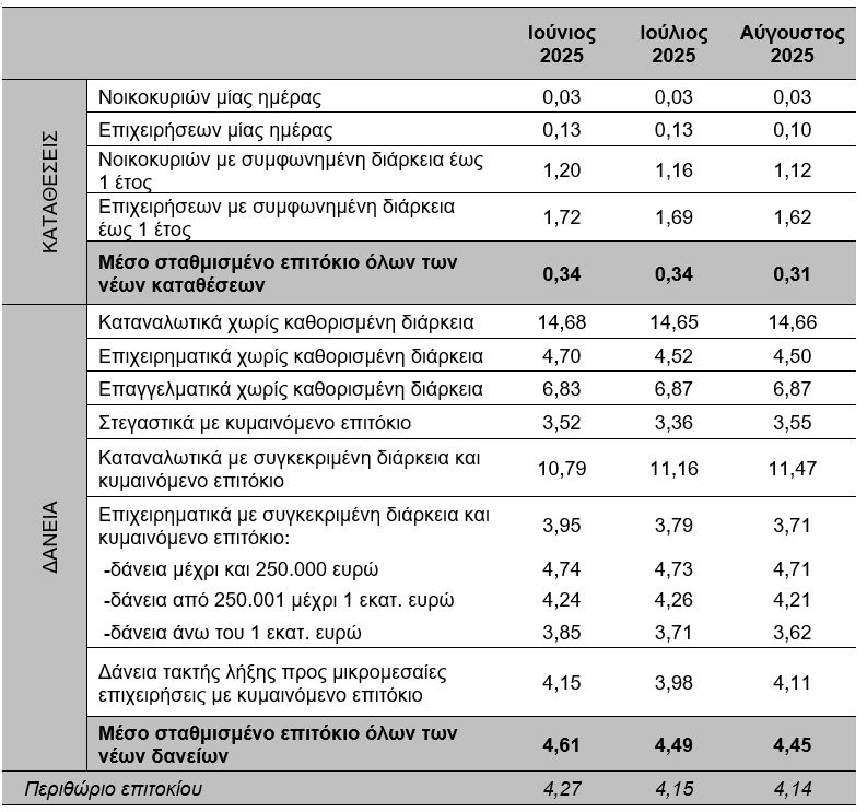 Τον Αύγουστο του 2025, το μέσο σταθμισμένο επιτόκιο του συνόλου των νέων καταθέσεων μειώθηκε κατά 3 μονάδες βάσης, σε σχέση με τον προηγούμενο μήνα, και διαμορφώθηκε στο 0,31%.