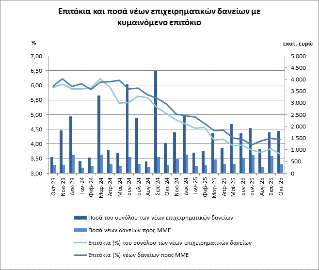 - Τον Οκτώβριο του 2025, το μέσο σταθμισμένο επιτόκιο των νέων καταθέσεων παρέμεινε σχεδόν αμετάβλητο στο 0,32%, ενώ το αντίστοιχο επιτόκιο των νέων δανείων μειώθηκε στο 4,45%.