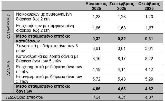 - Τον Οκτώβριο του 2025, τα μέσα σταθμισμένα επιτόκια του συνόλου των υφιστάμενων καταθέσεων και δανείων παρέμειναν σχεδόν αμετάβλητα στο 0,31% και 4,62% αντίστοιχα.