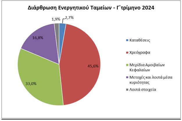 Η αξία των συνολικών τοποθετήσεων των Ταμείων σε χρεωστικούς τίτλους αυξήθηκε στα 1.108 εκατ. ευρώ στο τέλος του γ΄ τριμήνου του 2024, έναντι 1.063 εκατ. ευρώ το προηγούμενο τρίμηνο. Η εξέλιξη αυτή οφείλεται κυρίως σε καθαρές αγορές κυβερνητικών ομολόγων του εξωτερικού, οι οποίες αντισταθμίστηκαν εν μέρει από καθαρές πωλήσεις ελληνικών κυβερνητικών ομολόγων, καθώς και σε αύξηση των αποτιμήσεων του συνόλου των ομολόγων. Το ποσοστό των χρεωστικών τίτλων επί του συνολικού ενεργητικού αυξήθηκε στο 45,6% το γ΄ τρίμηνο, έναντι 45,3% το προηγούμενο τρίμηνο.