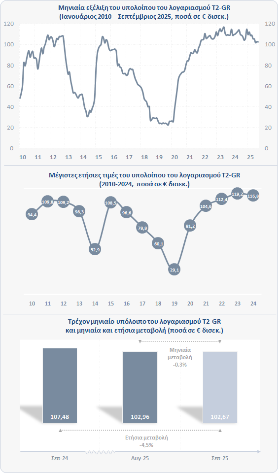 Στα Διαγράμματα που ακολουθούν απεικονίζονται η διαχρονική εξέλιξη του υπολοίπου (ποσά σε δισεκατομμύρια ευρώ) του λογαριασμού BoG ECB account στο TARGET, οι μέγιστες ετήσιες τιμές του, καθώς και η πρόσφατη μεταβολή του σε ετήσια και μηνιαία βάση.